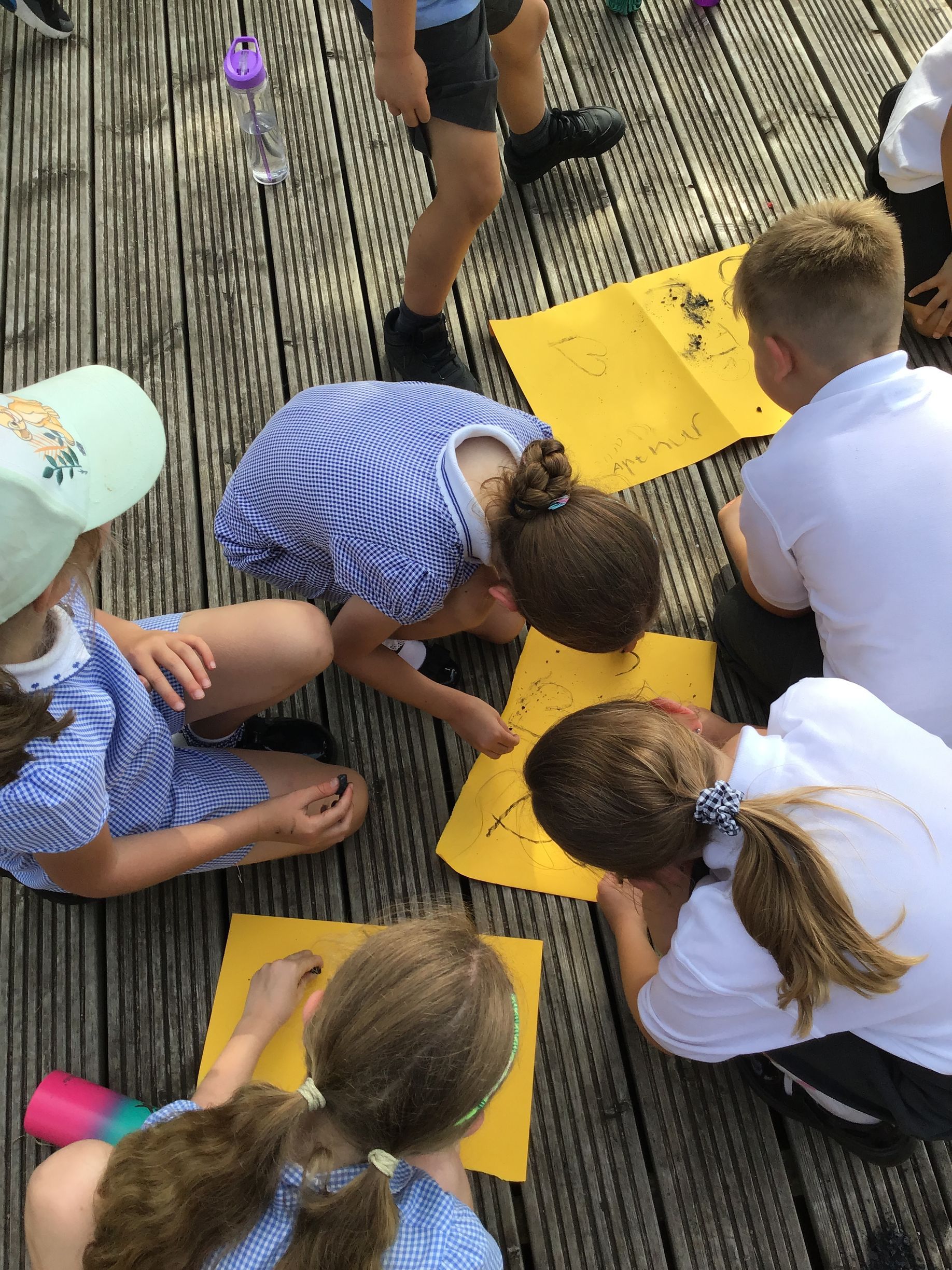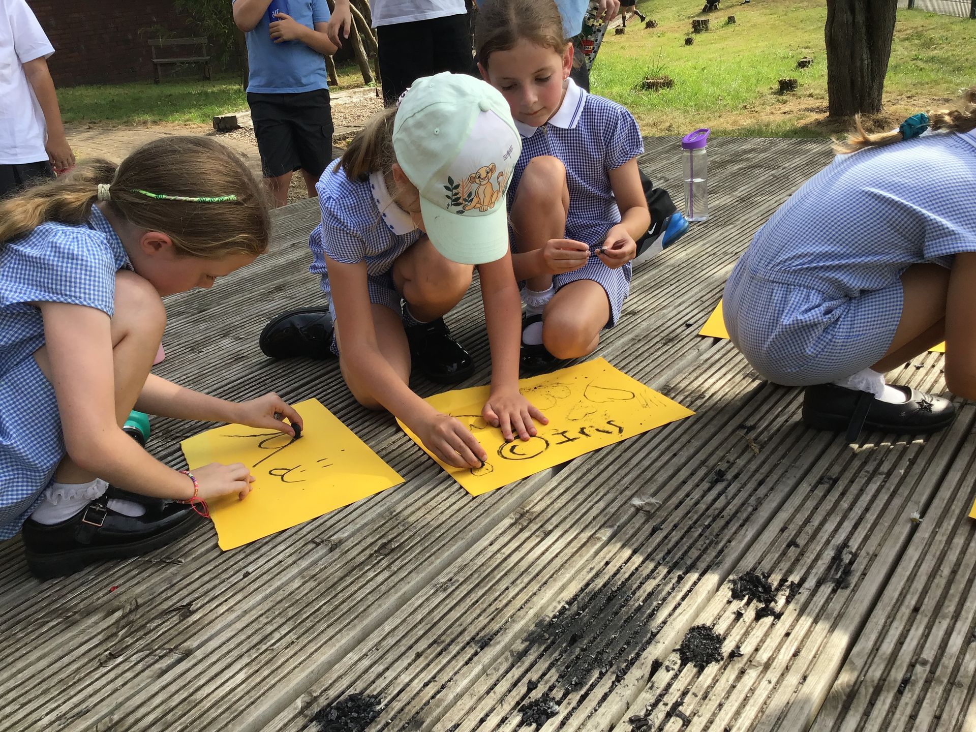 Class 3 went on a spider hunt and found different types of spider webs, including sheet, triangular, orb and funnel. We learnt that an important part of Forest School is to respect every other and every living thing. So we didn't catch the spiders we saw, instead, we made some. We made stone spiders and learnt to knot and weave with wool to make our very own webs. We drew spiders using charcoal from Mr Watt's fire circle.